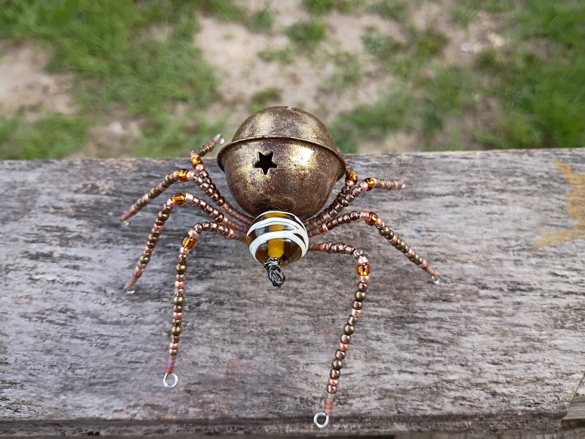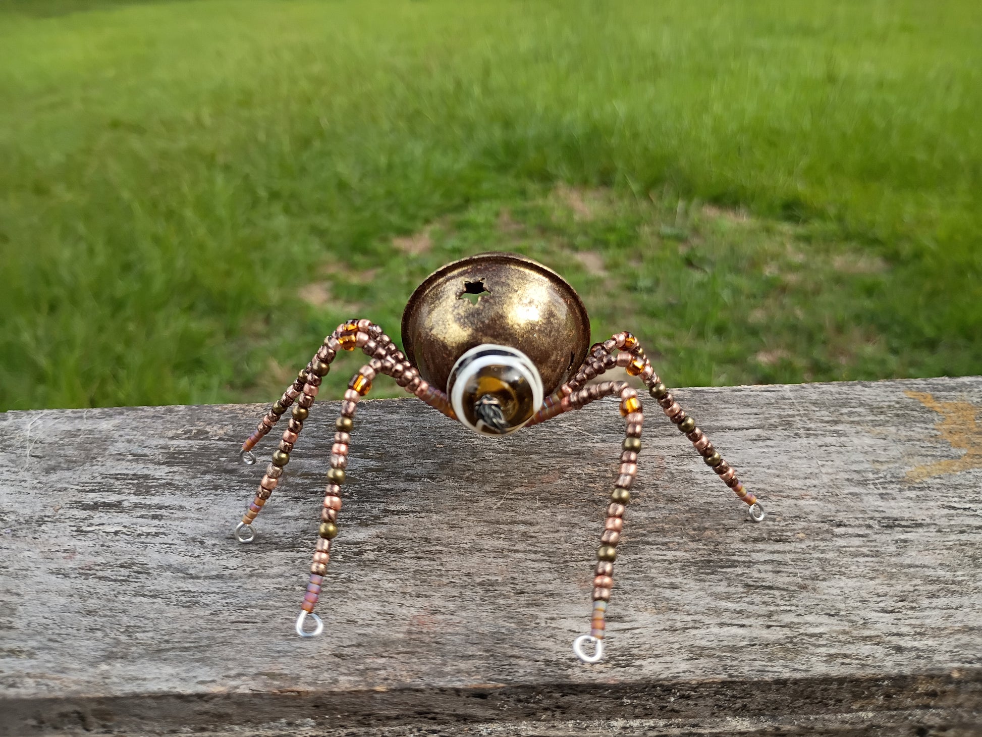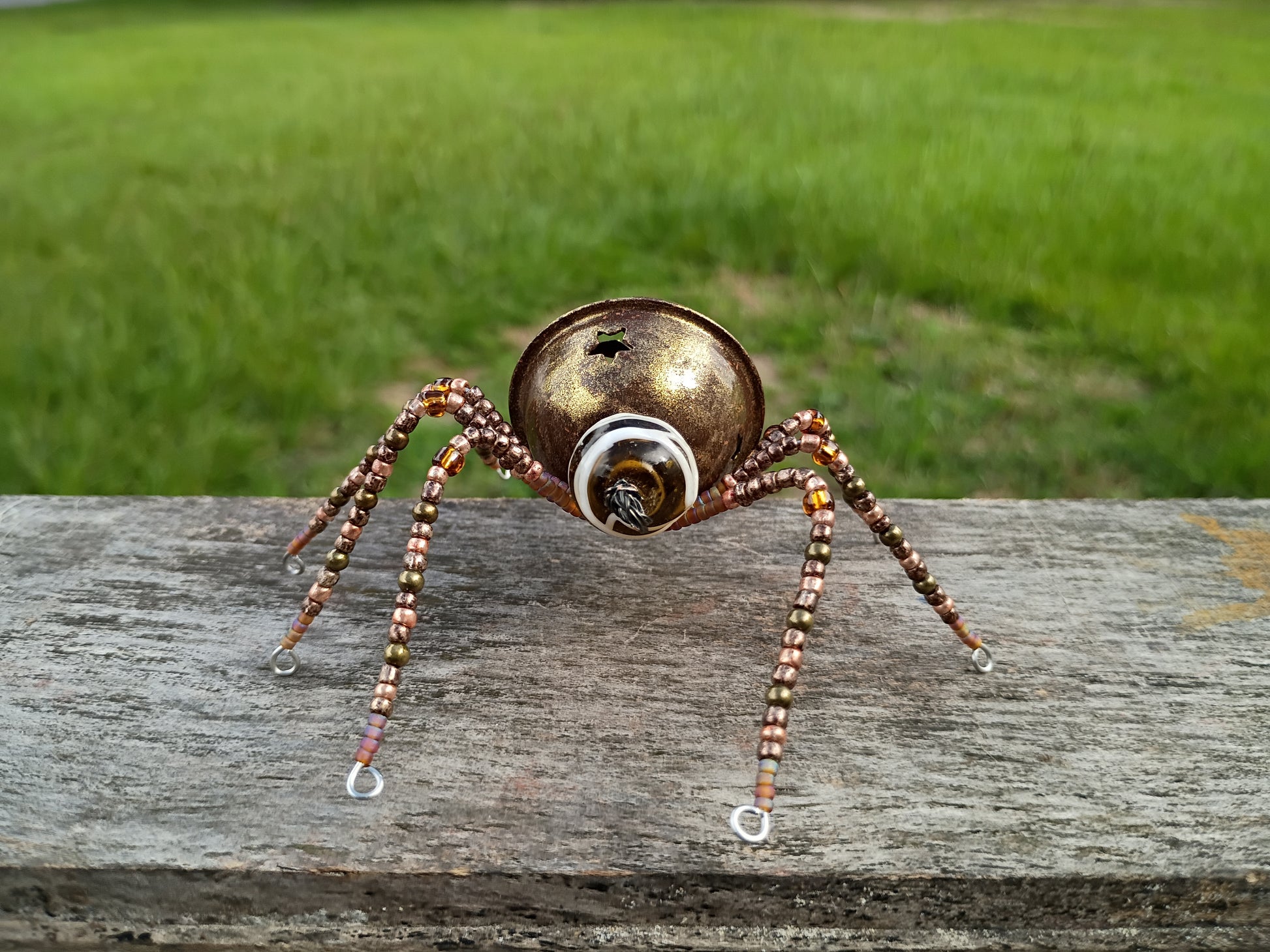 Handcrafted using a mix of antiqued brass and amber-colored glass seed beads, and coated copper wire, this spider's slender legs are truly a sight to behold.