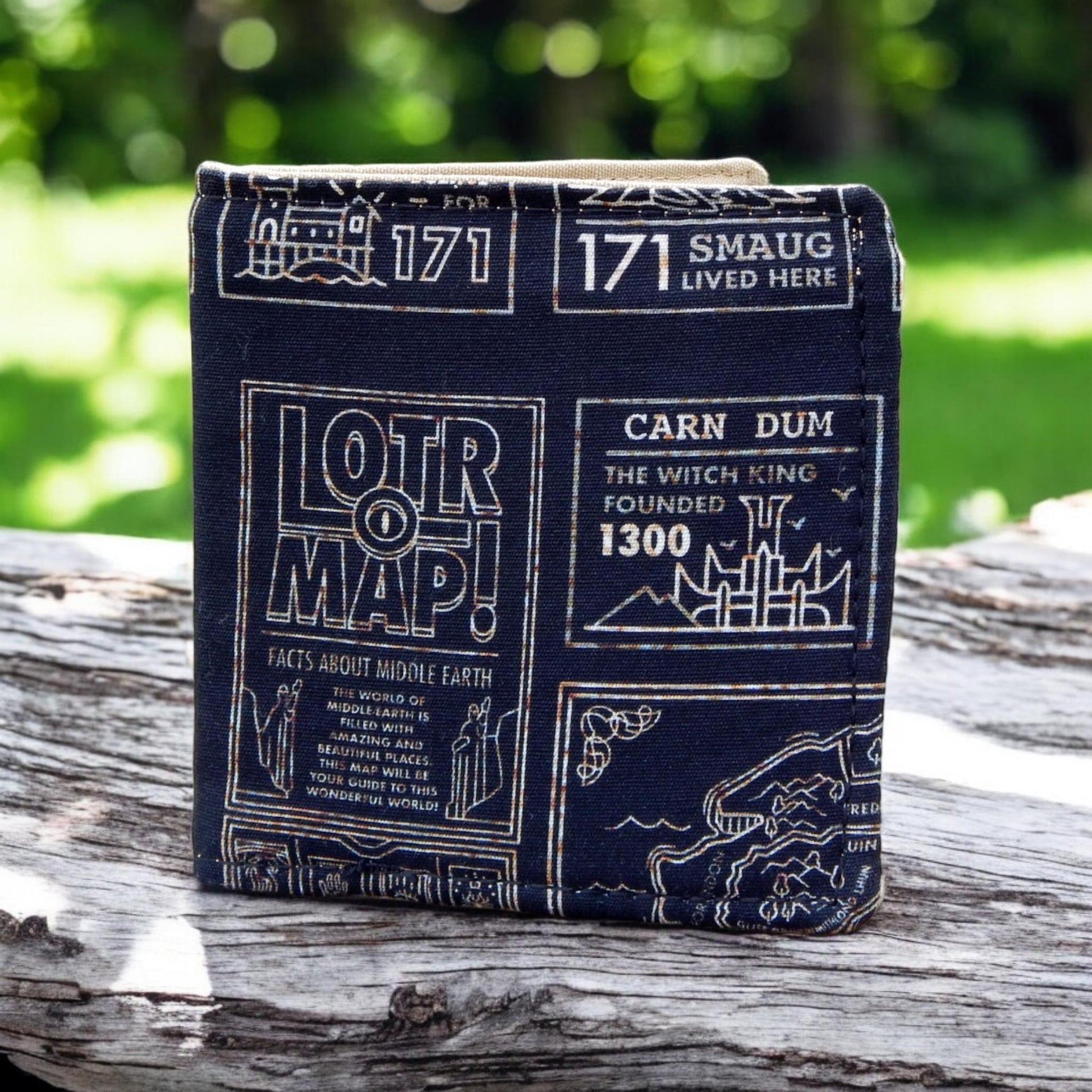 On this bi fold wallet LOTR map themed fabric is sure to delight any fan of the movies or books, the lining is a tan combined with a custom print with some of the characters.