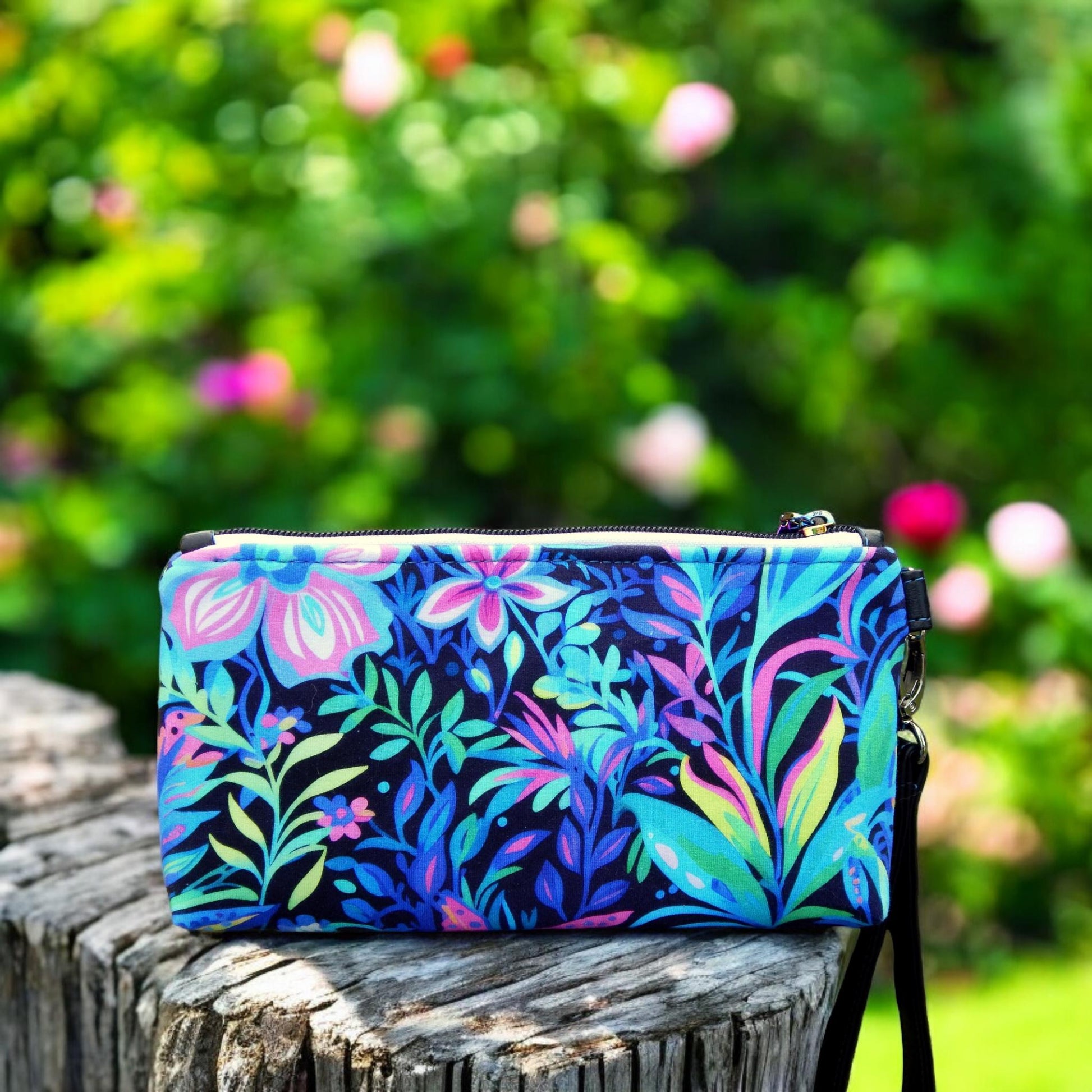 Floral wristlet purse, zippered pouch, handcrafted purse, unique gift, ready to ship, floral bag, wrist strap, unisex bag, harlequin purse