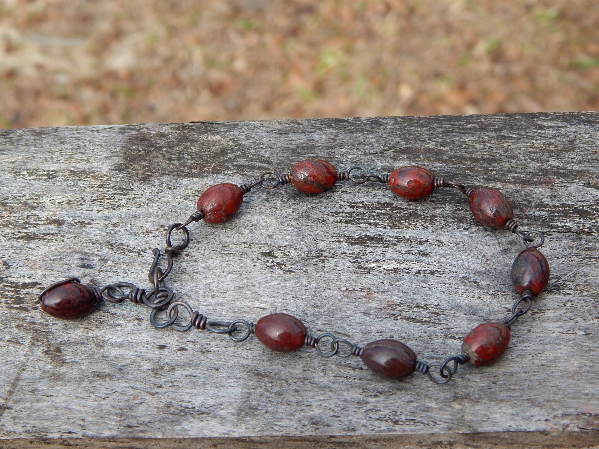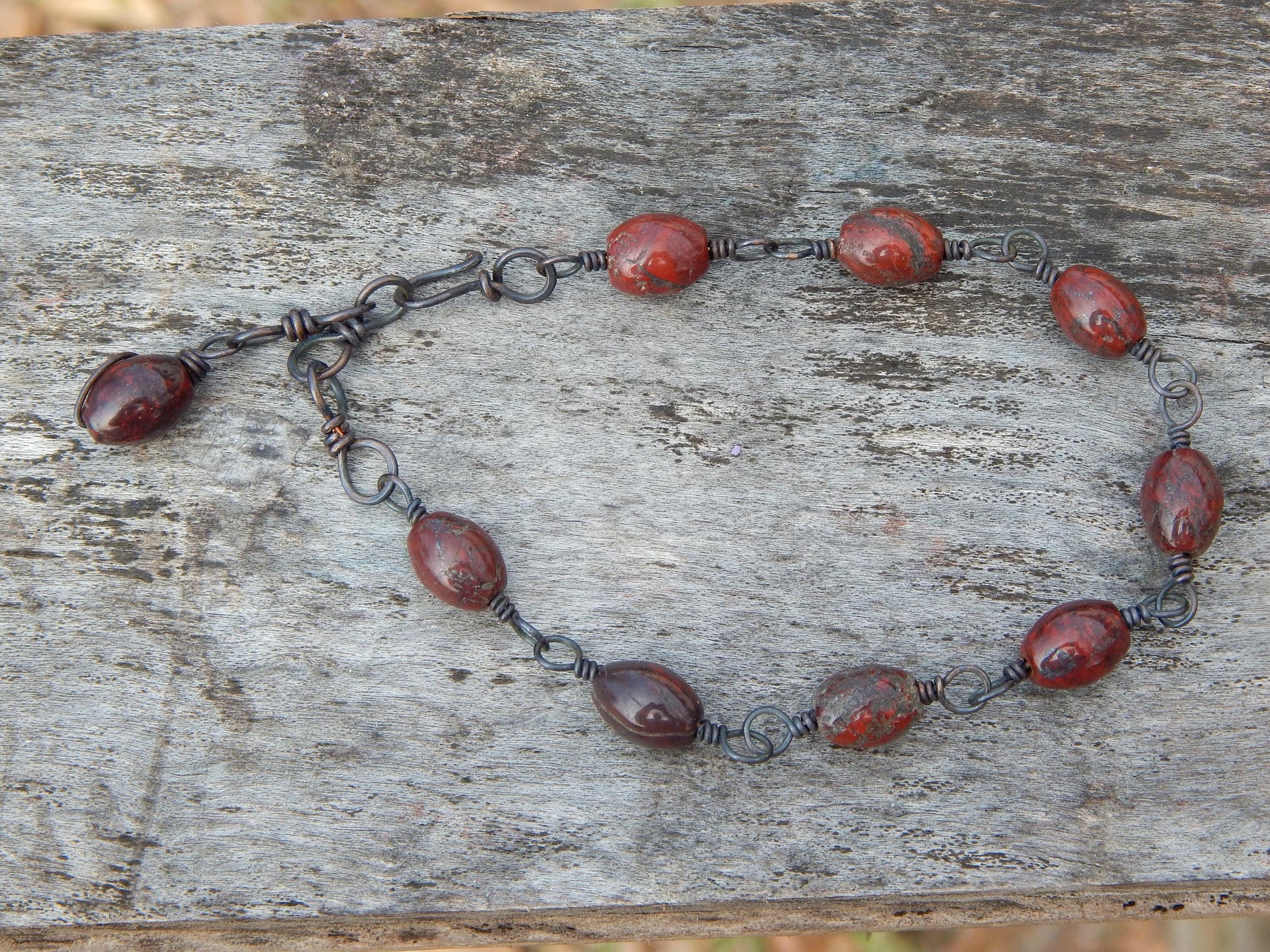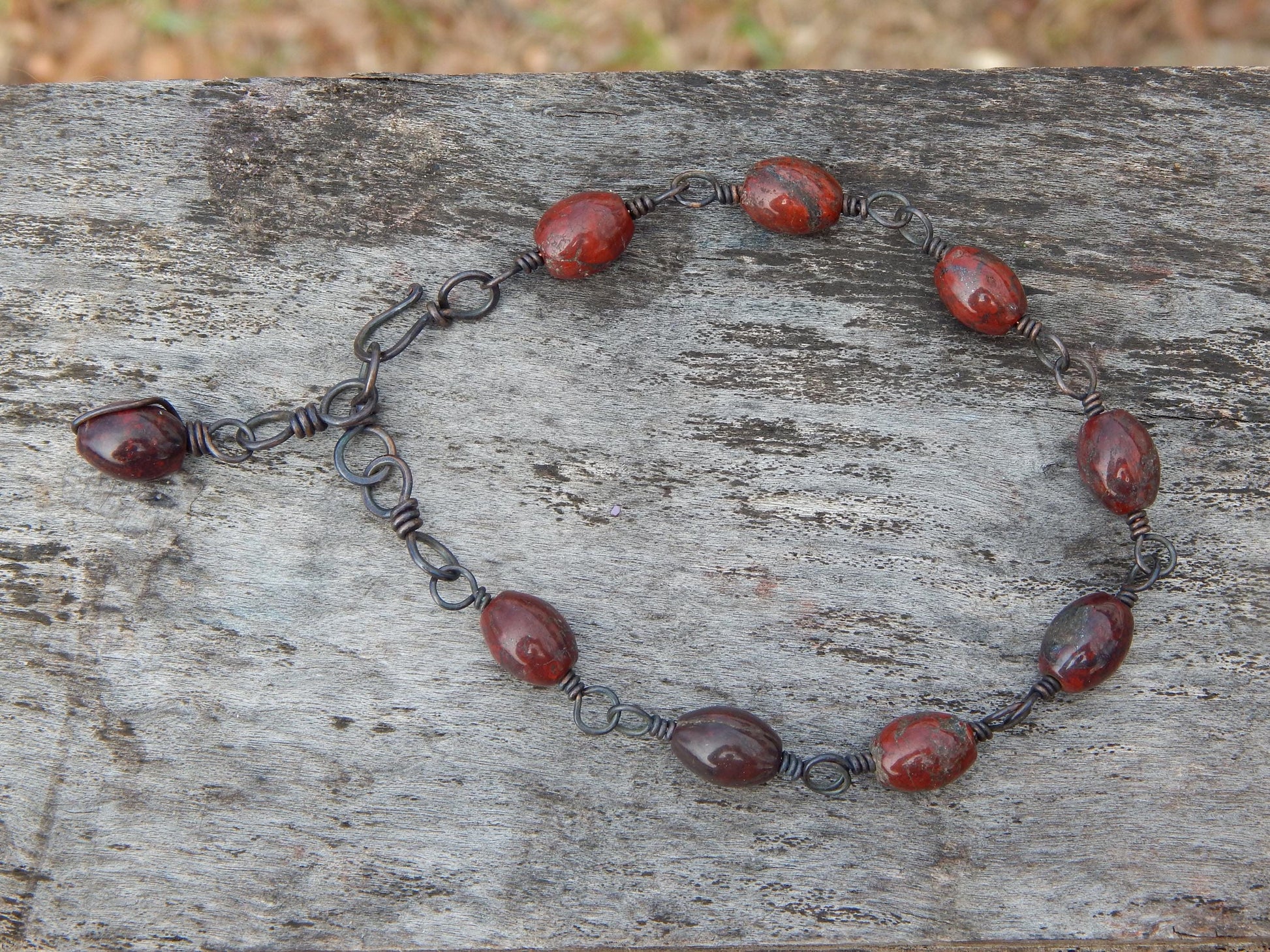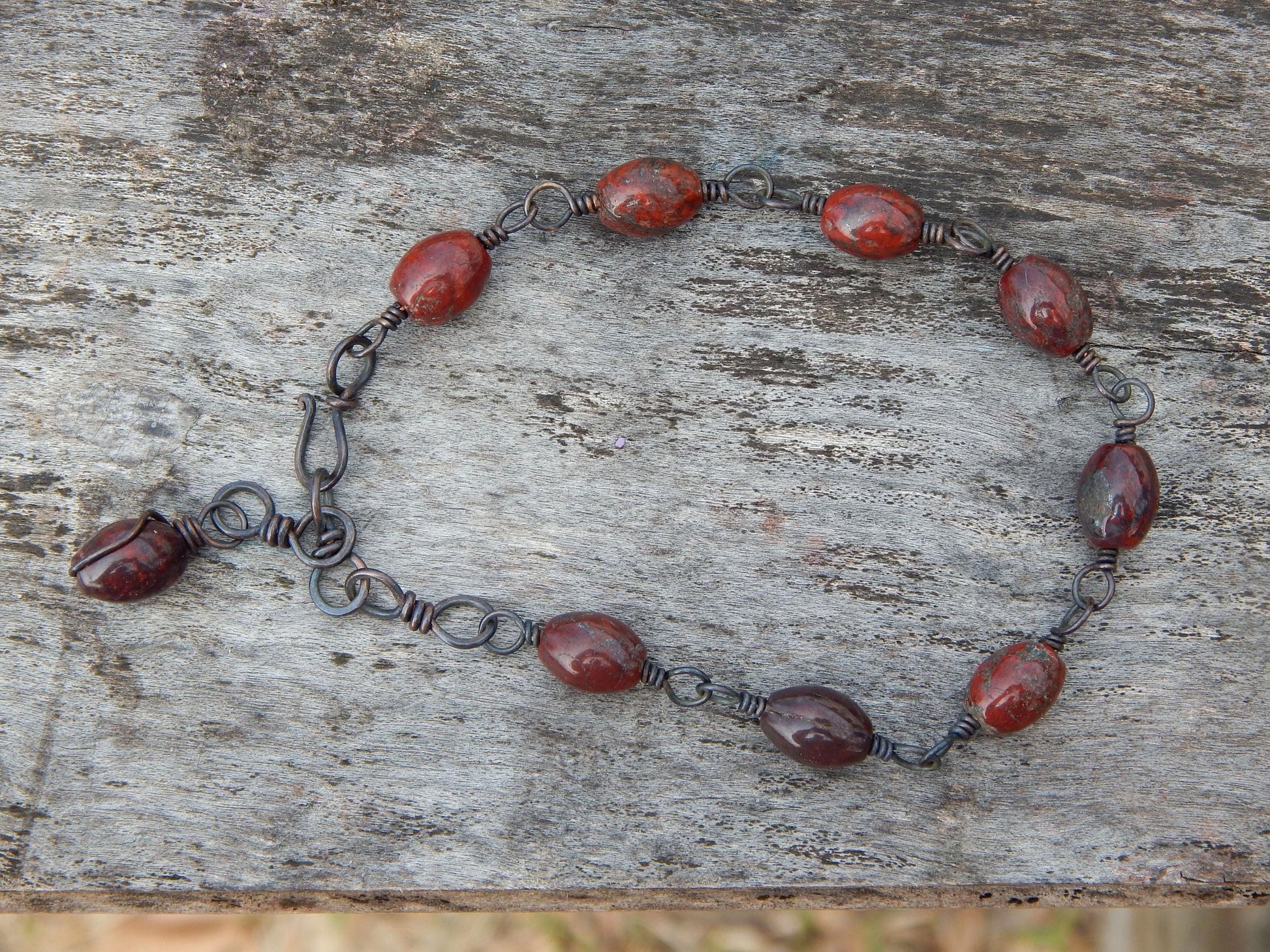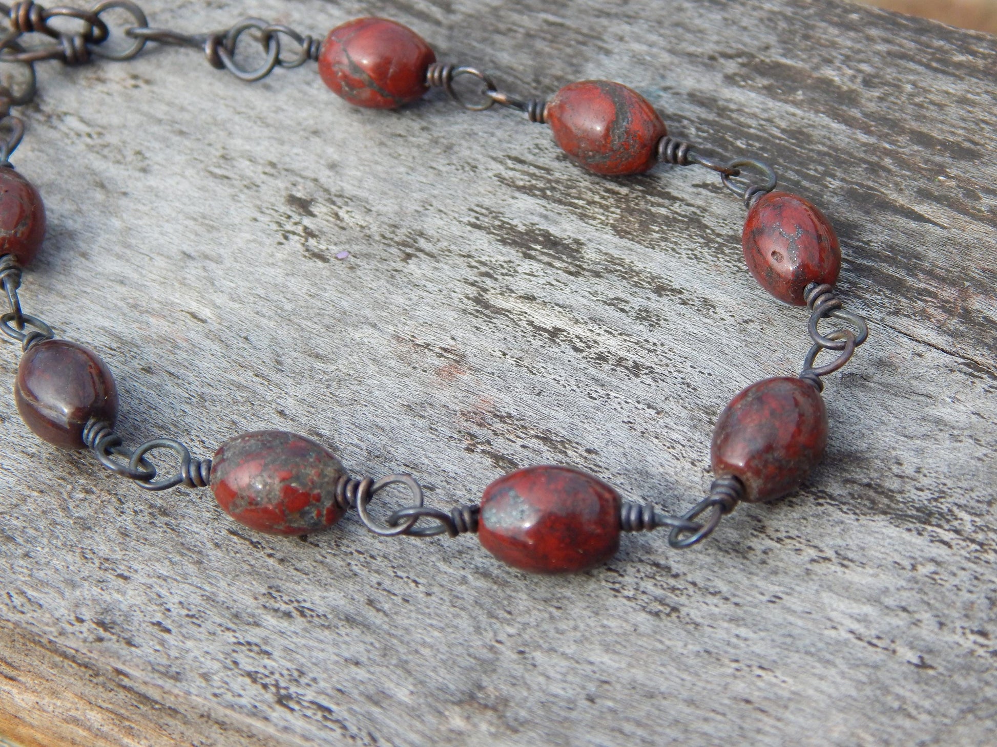 This earthy beaded gemstone bracelet has beautiful multi-hued reddish brown jasper beads, they are wrapped with recycled bare copper wire that has been given a dark patina that with wear will fade to a burnished copper.