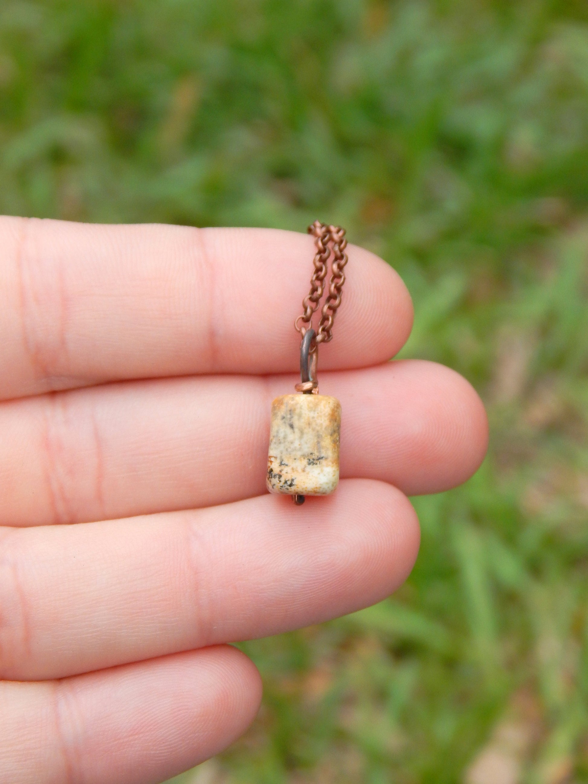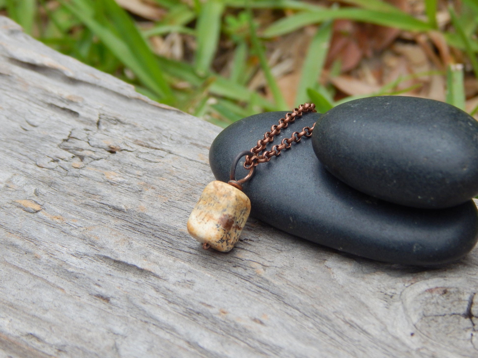 On this simple pendant a tiny cream/brown speckled landscape jasper bead is the focal, it has been wrapped with recycled bare copper wire that has a natural dark copper/green patina.