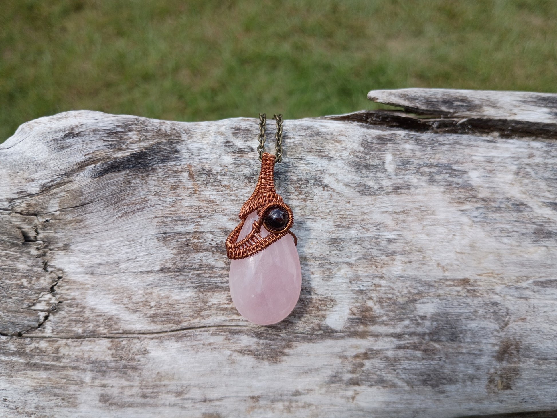 This wire wrapped pendant has a lovely light pink rose quartz bead as the focal and a deep red garnet bead tucked into the wrap, it is wrapped with recycled bare copper wire.