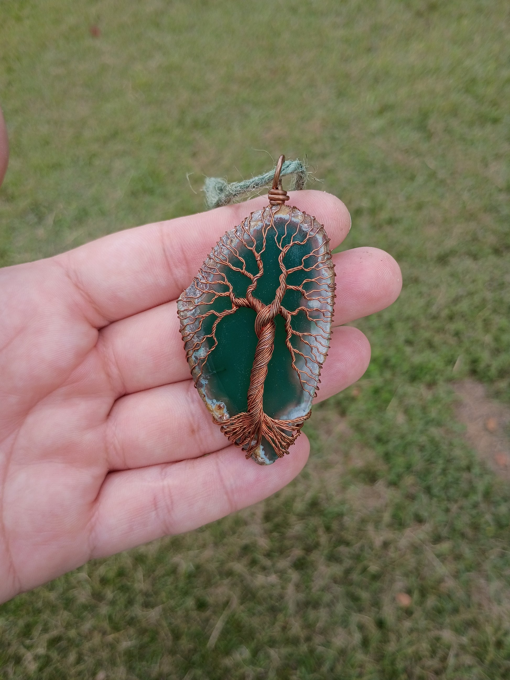 A dyed green agate slice forms the base, while recycled bare copper wire is carefully wrapped and twisted to create a unique tree of life design, the copper has been left bare to patina naturally over time.