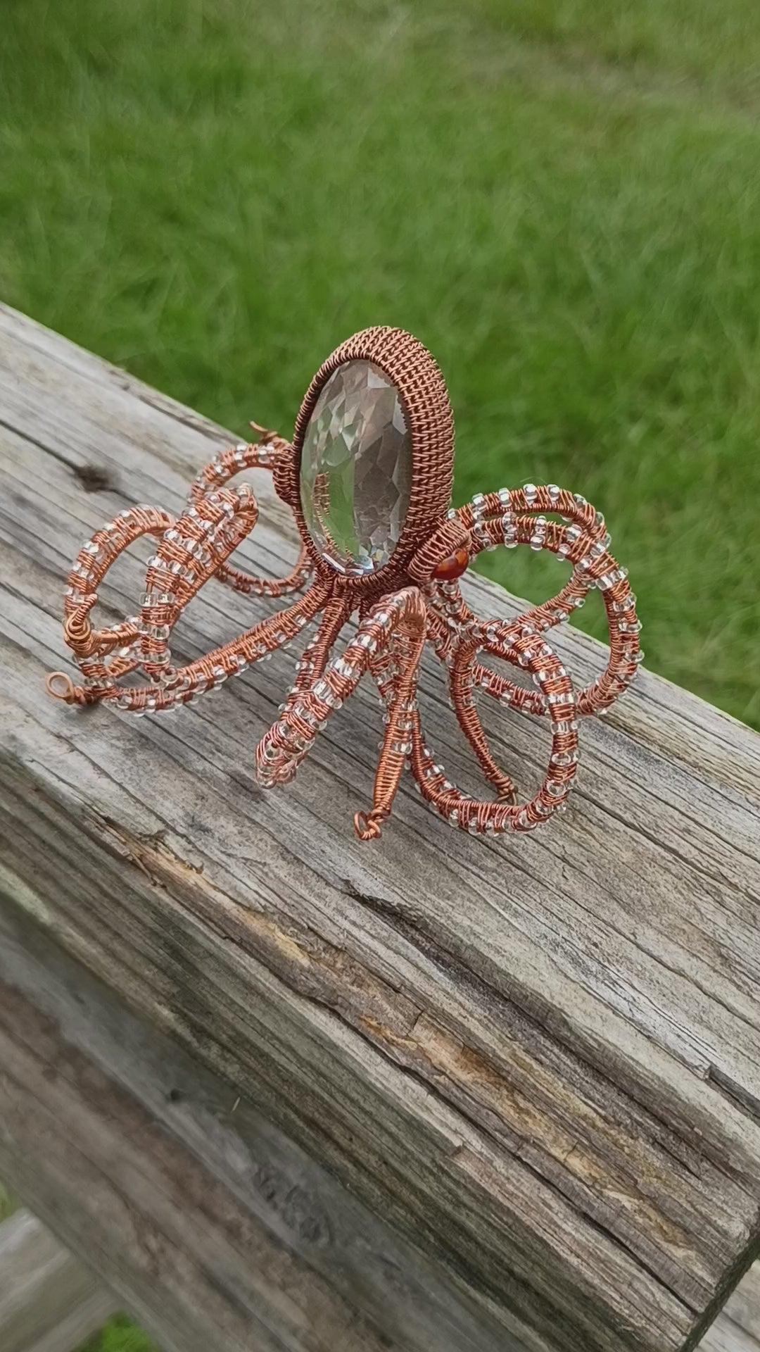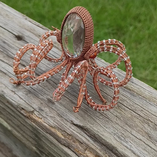 His head is a stunningly clear faceted quartz gemstone and clear glass beads make up his suckers, his eyes are deep orange carnelian beads.